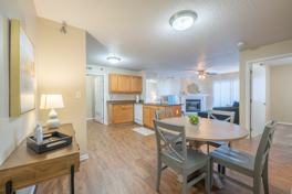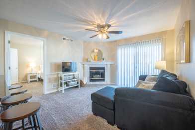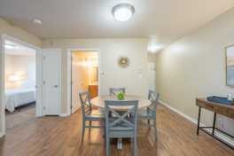 The unit is spacious but also offers all the accommodations of home. As you enter the front door, you'll find a coat closet and an entry table. The dining room has seating for 4 with additional seating for 2 at the eat-in kitchen. The kitchen has all the appliances you would need (toaster, Keurig, microwave, etc) as well as bakeware, kitchen gadgets, etc. Just off the kitchen is the full-size washer/dryer with drying rack, iron, etc. The living room is cozy with a gas fireplace, couch, side chair and a slider to the patio. The 55" smart TV is ready to go for streaming or there are included channels as well! Wifi is available throughout the unit and you'll also find a pack n' play and high chair. Off the main living area is a full-size bathroom and bedroom. The primary bedroom offers a king bed, television, room darkening curtains and dresser. The primary has its own bathroom with shower and walk-in closet. Both bedrooms have mini-blinds as well as room darkening curtains.