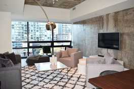 Explore this fantastic 1-bed, 1-bath Entertainment District Furnished Condo Rental at Theatre Park with 920 sqft of living space, floor-to-ceiling windows, and exposed concrete walls and ceilings. The kitchen boasts quartz counters, European-style cabinetry, and stainless steel appliances. The condo is fully equipped with kitchenware, and you can enjoy meals at an oversized dining set. The living room has a flat-screen TV, and the bedroom features a queen-size bed.