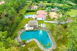Serenity & privacy on expansive 5 acre gated estate w/privacy hedge. Rent includes pest control & salt water treatment. Hacienda style 4 BR, 3BA home w/high ceilings, crown molding, remodeled oversized kitchen (thick counters, wine cooler) & spa-style primary bath. Available semi-furnished Raised garden beds to create organic produce. Desirable location close to community entry & 30AC equestrian area. Numerous outdoor living spaces: tiki hut, pool, hot tub, fire bowl, hammock, private lake w/waterfall. Former barn is a large open space (water, electric, lighting), Landlord open to barn modification at Tenant's expense. Detached 3 car garage & oversized circle motor court. Just off PGA, close to park w/tennis & private airport, PGA National, fine dining, & state-of-the-art medical facilit