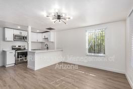 Welcome to your next home! This beautiful 3-bedroom, 2-bath single-level townhome in Phoenix blends modern style with everyday comfort. The open floor plan features warm wood-look flooring, while the sleek kitchen boasts white shaker cabinets, stainless steel appliances, and a spacious peninsula—perfect for cooking and entertaining. Natural light fills every room, creating a bright, inviting atmosphere. Step outside to a charming front porch, ideal for soaking up Arizona’s sunshine. Nestled in a secure gated community with easy access to shopping, dining, and entertainment, this home offers both tranquility and convenience. Don’t miss the chance to make it yours!