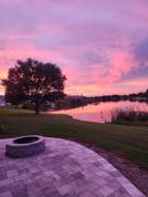 Large sliding glass doors lead to a screened porch with tiled flooring and ceiling fan, extending to a paved patio with fire pit area overlooking the lake the perfect place to relax, entertain, or watch the sunset. A built-in pet door provides convenient access to the screened patio.