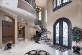 THE ENTRY: The entry foyer is breathtaking. You'll be greeted by oversized etched marble flooring, designer chandelier and a radiused wood staircase wrapping upward to your right. The curved stairs are graced with a custom iron and wood railing and feature a second chandelier (by the way, there is a third chandelier just beyond in the living room and all three are installed on motorized lifts for ease of maintenance). The stair tower is enhanced by windows and vertical stacked split-stone that creates texture elegance. Directly ahead, the living room is graced with a soaring curved wall of glass overlooking the stone patio and porches, the infinity-edge pool and spa and the glass rail that separates the property from the lake and golf course beyond. Additionally, the living room features a stone fireplace rising some 24-feet to a hand-crafted ceiling and molding details and exquisite trim.