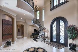 WELCOME TO 3059 WYNDHAM WAY: Just minutes from the ocean and rivers, a short drive to the Space Center and space and defense industry facilities, two international airports and the amenities of Orlando, this home is worthy of consideration by any discerning individual looking for the epitome of luxury Florida living. Arguably the finest home ever designed and constructed by one of Brevard's most elite luxury builders, it was personally crafted for the recently retired CEO of a Fortune 500 Company headquartered in Melbourne Florida. The craftsmanship and detail are unsurpassed; the flow and floorplan flawless; and the amenities stagger the imagination. With over 8,400 square feet of living area and some 12,700 square feet of total structural area, this architectural....MORE masterpiece is situated on a double-lot in the prestigious guard-gated luxury community of Wyndham at Duran and overlooks the 15th fairway of the Duran Golf Course. The sense of arrival is not taken lightly as there is both a circular front drive and private gated motor courtyard leading to two garages with spaces for 5 cars and loft storage above. The grounds are lush and manicured with a private putting green and ample room for gatherings and festivities. The structure itself is constructed to impress, with a two-story foyer, circular stair tower, custom-crafted arched custom iron doors, precast moldings and columns and tongue and groove cypress ceilings at the entry and on the back porches and balconies. The facade is adorned with soffit and landscape lighting to accentuate the details and create a glow to the home at evening. THE ENTRY: The entry foyer is breathtaking. You'll be greeted by oversized etched marble flooring, designer chandelier and a radiused wood staircase wrapping upward to your right. The curved stairs are graced with a custom iron and wood railing and feature a second chandelier (by the way, there is a third chandelier just beyond in the living room and all three are installed on motorized lifts for ease of maintenance). The stair tower is enhanced by windows and vertical stacked split-stone that creates texture elegance. Directly ahead, the living room is graced with a soaring curved wall of glass overlooking the stone patio and porches, the infinity-edge pool and spa and the glass rail that separates the property from the lake and golf course beyond. Additionally, the living room features a stone fireplace rising some 24-feet to a hand-crafted ceiling and molding details and exquisite trim. WEST WING, PRIMARY BEDROOM AND OFFICE: From the foyer, proceed to the west wing of the home, past the circular stairs and pool bath, where a double-doored entry takes you to the primary suite. The foyer is handsome and oversized and leads to opposing entries. To the left is the main bedroom and to the right is the richly paneled home-office or study. This warm and inviting space features a radiused wall of split-stone with inset television monitor and library paneled walls rising from the floor to the fully paneled ceiling. Additionally, there is built-in cabinetry, bookcases, and window seat file-cabinetry. One can only imagine the care taken to create such a lush environment. Working at home, entertaining friends or clients, or simply enjoying a peaceful respite from the world...this private haven is ideal. To the left of the primary wing entrance is the main bedroom. Warm and welcoming, soft but substantial, this room boasts the..