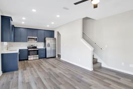 The layout is ideal for roommates or anyone who values privacy, as each bedroom has its own private bathroom. Inside, you’ll find contemporary finishes throughout, including luxury vinyl plank flooring in the living areas and tiled bathroom floors. The kitchen stands out with white quartz countertops, blue cabinetry, and modern brass fixtures, creating a clean, upscale feel. The primary bathroom delivers a spa-like touch with a tiled shower featuring dual shower heads.