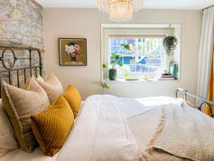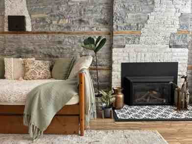 Serene Bedroom: Retreat to the lower-level bedroom in the limestone walled basement, featuring a queen sized bed and daybed that is used as a couch or space for your guests to stay.