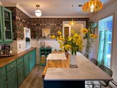Kitchen is fully equipped as a culinary haven with green cabinetry, brass accents, and butcher block countertops, perfect for creating and entertaining. Small Oven/Air Fryer, Fridge, Induction Top, Miele Dishwasher.