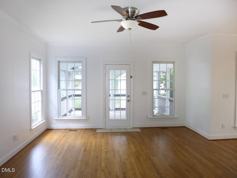 This well appointed home is in Southern Village, one of Chapel Hill's most popular communities. This community is a short drive or bike ride to UNC and Chapel Hill, with a convenient Park and Ride for Chapel Hill fare free bus line. Walk to Market Street shops, theatre and restaurants. Enjoy the walking trails and area play grounds. Join Southern Village's swim and tennis club. There is something for everyone in this community. This home features hardwood floors throughout. The transitional floor plan includes the open living room, kitchen and breakfast area. The living room includes a ceiling fan and has an exit to the screened porch on the back side of the home. This space is open to breakfast area and the kitchen over a wide angled serving or breakfast bar. The kitchen features granite counters, white cabinets, stainless appliances, a pantry closet, and a tile backsplash. There is recessed lighting in the kitchen, with pendant lighting over the breakfast bar. There is a separate formal dining room off the entry foyer. The dining room is detailed with a classic chair rail. A half bathroom completes the main level of the home. All bedrooms are on the second level. Each bedroom has a ceiling fan and a supplemental mini split ac unit. The master bedroom has a raised trey ceiling, an en suite master bathroom and a walk-in closet. The master bathroom includes a dual sink vanity, a garden tub, and a separate tile surround shower. The second full bathroom is also on this level. The laundry closet is on the second level, with a washer and dryer included. The raised screened porch offers a comfortable outdoor space with a vaulted ceiling with a ceiling fan. The screened porch leads out to the backyard and the detached two car garage behind the home. $15/mo filter fee.