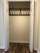 - Coat closet with shelf/coat hooks; shoe closet, and linen closet with adjustable shelving