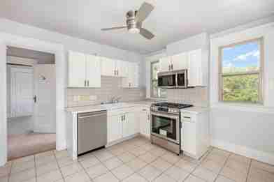 The updated kitchen features stainless steel appliances — range, microwave, dishwasher, and refrigerator — complemented by white cabinetry, tiled backsplash, and ample counter space.