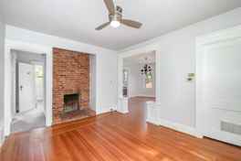 A formal dining room with a chandelier and original built-in hutch connects the kitchen and living space, perfect for entertaining or enjoying a cozy dinner.