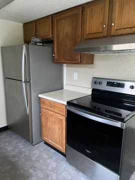 Kitchen includes electric stove and refrigerator and very nice cabinet space.