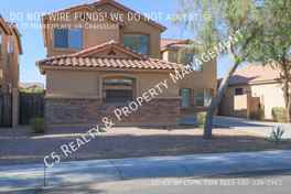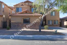 Don't miss this incredible 4 bedroom / 2.5 bathroom single-family home with a three-car garage in Maricopa! This spacious home features carpet and laminate hardwood flooring, ceiling fans, a loft, and plenty of storage space. The kitchen comes complete with a pantry, breakfast bar, and appliances including an oven, refrigerator, and a dishwasher! Washer/dryer included. Work/study from home in your private den/office! The primary bedroom includes dual closets plus a private bathroom with a separate shower/tub and dual sink vanity. Enjoy sunny Arizona in your private fenced-in backyard with a covered patio, pavers, and desert landscaping! Contact us to see this home today!