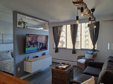 Furnished, top floor, Jr one bedroom. Available January 1st, 6 month - 1 year term preferred. Bright, north-facing with views to city and North Shore Mountains. Steps to rooftop pool deck with expansive views of English Bay. 5 minute walk to St. Paul's Hospital, 5 minute walk to the beach. Off-street parking available for additional monthly charge.