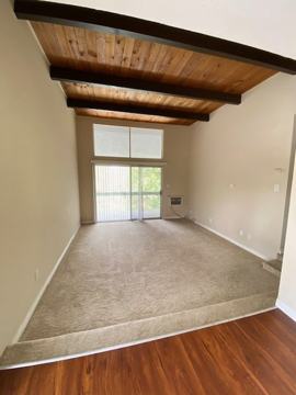 -Open dining area with balcony leading down to a spacious living room with vaulted wood ceilings, AC unit, and large patio overlooking the park.