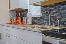 Open kitchen with granite countertops & stainless steel appliances
