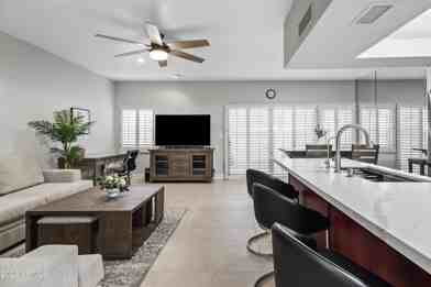 Fully furnished vacation rental available April 1, 2025! Beautifully remodeled 2 bedroom, 2.5 bath townhome located in the prestigious, gated Racquet Club community of Scottsdale. The home boasts high ceilings, abundant natural light, and a spacious open floor plan. Ideal for entertaining, the main living area features a luxurious kitchen with quartz countertops, breakfast bar, tile backsplash, ample cabinet space, and opens to the adjacent dining and living room. The kitchen/ dining area look out onto the small private backyard w/ artificial turf, outdoor dining, and covered patio. Retreat upstairs to the remodeled master suite, complete with a private balcony, walk-in closet, & ensuite bathroom featuring a large over-sized shower and dual vanities. Also upstairs, is the secondary bedroom and bathroom. The Racquet Club community offers numerous amenities, including six sparkling swimming pools, tennis courts, fitness center, and a clubhouse. With its prime location in Scottsdale, you'll have easy access to shopping, dining, and entertainment. Nearby golf courses, hiking trails, & parks provide endless opportunities for outdoor recreation. A must see!
