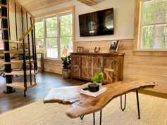 The open-concept main level features a living area, kitchenette, and full bath with walk-in shower. The living area invites you in with oversized chairs, a leather sofa, and a 50" flat screen smart TV. The kitchenette offers rustic charm, equipped with electric hotplates, a toaster oven, convection microwave, drip coffeemaker, pots/pans, and dinnerware. The spiral staircase leads to the loft bedroom, featuring an electric-profiling queen bed and high efficiency washer/dryer.