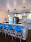 All new eat-in kitchen with Valencia granite, pendant lighting, subway tile backsplash, stainless steel appliances and gas range with center grill.