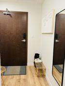 The available corner bedroom boasts incredible city views, furnished with a single storage bed, mattress, electric standing desk, office chair, waste bucket, lamp, laundry basket, body-mirror, and additional wall cabinet. Move-in ready with it's own closet. The bathroom features a bathtub/shower combo with privacy glass enclosure, standard toilet, single vanity, mirror with storage, and trash bin.