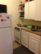 -Fully equipped galley kitchen with full sized fridge, four burner stove