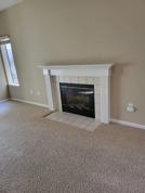 Large living room & dining room, with updated lighting and high-grade carpet and wood burning fireplace.