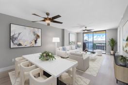 Beautifully remodeled 2/2 condo with a top floor location in this quiet, gated, waterfront community by the intracoastal. Enjoy the water views in front and back from your private balcony. This home has remodeled kitchen and baths, all hurricane impact windows, a new washer and dryer, A/C 2024, custom closets with built-ins, a storage unit and more. An added bonus is the Loggerhead Marina right next door, great for boating enthusiasts. See it today!