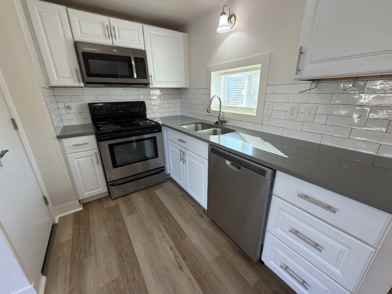 Beautiful single-family home for rent featuring new flooring throughout. The main living area showcases stylish white shiplap walls, and the property offers a spacious layout with 3 bedrooms, including a master suite with en suite bathroom. The large, fully enclosed backyard provides plenty of outdoor space.