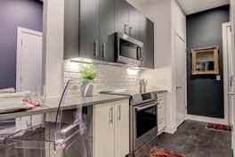 - Modern kitchen equipped with a refrigerator, electric range, dishwasher, microwave, and garbage disposal