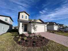 Two-story house with 4 bedrooms, 2 full bathrooms and 1 half bathroom located in a planned community in Minneola. The residence features a covered porch and garden at the entrance, offering charm and coziness upon arrival.