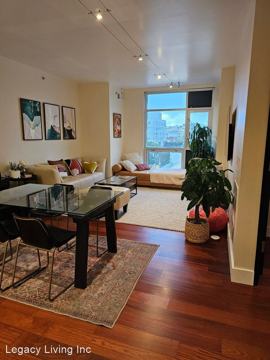 SLEEK & MODERN 1 Bed/1 Bath Condo - NOB HILL - This modern 1 Bed/1 Bath condo has impressive floor to ceiling windows framing a stunning cityscape view, letting in lots of natural light and an open, spacious feel. There is a space for dining as well, and a sleek, vibrant kitchen. The white refrigerator is styled to match the cabinetry, and the red coloring of a few of the cabinets makes a bold, invigorating statement. The stainless steel stove and dishwasher have a similar minimalistic design, creating a seamless look.