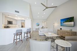 Indulge in the ultimate seasonal escape at Greenbriar in Bonita Bay with this turnkey-furnished top-floor 3 bedroom, 2 bath condo. Available April 2026 and beyond. This fully renovated residence offers luxury living with new vinyl plank flooring, soaring vaulted ceilings, and an open floor plan that blends style and comfort. The modern kitchen boasts quartz countertops, abundant cabinetry, and a spacious breakfast bar. The primary suite features a king-size bed, custom closets, dual vanities, and a walk-in shower, while the split-bedroom layout ensures privacy for guests. New A/C for peace of mind! Located in an elevator building, this top-floor unit offers stunning golf course and natural marshland views. Attached garage parking is included. Greenbriar amenities include a newly updated pool and spa pavilion, plus tennis courts. Bonita Bay is the epitome of Florida luxury with 5 championship golf courses, tennis, pickleball, bocce, a clubhouse with lifestyle, fitness, and spa facilities, a full-service marina, waterfront dining, a private beach park, 12 miles of biking and jogging trails, shuttle service to the beach club, and a rich calendar of social activities. Vacation in paradise!