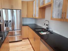 The beautifully appointed custom-designed kitchen includes solid maple cabinets with stained glass cabinet doors. All new LG stainless appliances including a gas cooktop, built-in oven, and microwave, deep stainless sink with disposal. Black granite countertops on the cooktop island and eating counter.