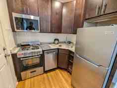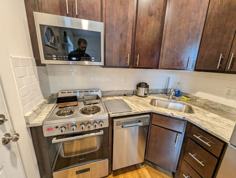 The apartment has brand new kitchen with dark cabinets, sleek granite countertops, and stainless steel appliances (including dishwasher). Bathroom has shiny white tiling, new toilet, vanity, lighting, and fixtures. Spacious enough for a large bed and furnishings.