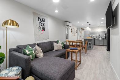 Experience Jersey Shore living year-round in this furnished, single family coastal retreat. This fully-renovated gem is ideally located just blocks to the beach and Ocean Grove's main thoroughfare of restaurants and shops. This charming and adorable abode boasts a wealth of features starting from the welcoming front porch where you can enjoy morning coffee. The open layout of the first floor provides the perfect entertaining space showcasing a beautiful, modern kitchen with center island, quartz countertops and a black stainless steel appliance package. Enjoy grilling and dining al fresco on the rear patio and rinse off in the outdoor shower after a day at the beach. Upstairs you will find both bedrooms, a bonus room which can be used as an office, play area or guest space as well as an enclosed sunroom perfect for relaxing and enjoying the ocean breeze. The luxurious primary bedroom with king-sized bed has an ensuite bathroom and the second bedroom features custom-made triple bunks ideal for family visits or hosting friends. Washer and dryer included for your convenience. Revel in all that this home has to offer and take full advantage of the neighboring beach towns of Asbury Park and Bradley Beach being just minutes away!