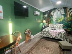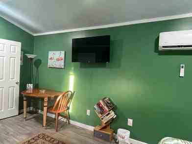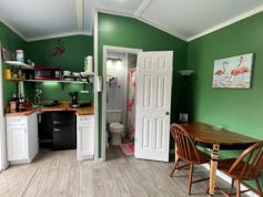 * kitchen (sink, 2 burner induction stove, microwave, small refrigerator, pots and pans, dishes and silverware, etc.)