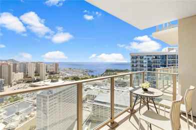 90-night minimum stay. This short-term rental is subject to availability. Enjoy the convenience of city living, with resort-style amenities at Sky Ala Moana West! This fully furnished, one-bedroom unit with floor-to-ceiling windows has two full beds and a pull-out couch in the living room. The kitchen is equipped with top-of-the-line Bosch appliances and Quartz countertops. Relax on the private lanai with sweeping city, ocean, and Diamond Head views. Enjoy the lavish spa-like bath after a long day.