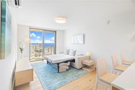 30-night minimum stay. Enjoy the convenience of city living, with resort-style amenities at Sky Ala Moana West! This fully furnished, one-bedroom unit with floor-to-ceiling windows has two full beds and a pull-out couch in the living room. The kitchen is equipped with top-of-the-line Bosch appliances and Quartz countertops. Relax on the private lanai with sweeping city, ocean, and Diamond Head views. Enjoy the lavish spa-like bath after a long day.