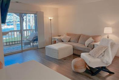 Ground floor, end unit, with a spacious living area offers a cozy fireplace and sliding glass doors with views of the lake, filling the space with natural light. Newly renovated granite countertops, cabinets, sinks and wood flooring throughout the apartment. Two bedrooms, each with a private bathroom and ample closet space. Washer / dryer, laundry pantry with storage shelving. 2 outdoor lockable storage units, located at the entrance and patio.