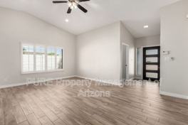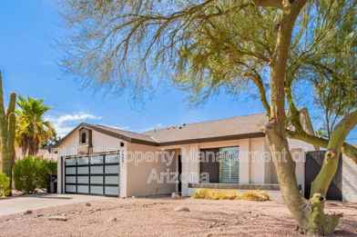 Pet FriendlyStep into your dream rental! This stunning 3-bed, 2-bath home boasts elegant vessel sinks, rich wood-look flooring, and a warm, luxe color palette that feels like a designer’s touch. Cook and entertain in style with stainless steel appliances, then unwind in your spacious backyard oasis featuring a covered patio, storage shed, and low-maintenance desert landscaping. The main bedroom offers French doors leading to your private outdoor retreat. Plantation shutters throughout add timeless charm and privacy. Every detail blends comfort with sophistication—ready for you to move in and make it your own!