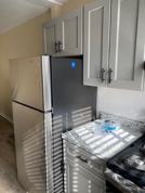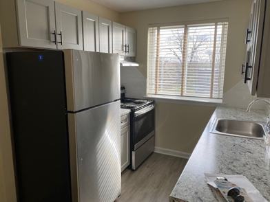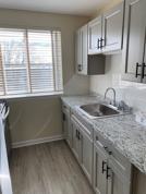 Gray remodeled one bedroom home; be the first to experience this gorgeous home featuring grey shaker style cabinets, a stunning white tiled backsplash, under cabinet lighting, stainless steel appliances, wood laminate flooring in the kitchen, dining and bathroom and plush carpeting throughout the rest of the home.