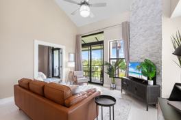 This beautiful 2 bed 2 bath fully furnished condo is located in the gated community of Winterset and boasts spectacular views of lake Winterset and the Legoland fireworks. This fully renovated condo is heaped in upgrades and is move in ready. As you enter the condo via your private entrance you will love the curved steps up to the brand new front door with ring doorbell. As you enter you will immediately notice the modern upgraded tiles throughout the unit, the 5 inch baseboards and amazingly tall ceilings ranging from 12 to 24ft. The glass sliding patio doors from the living area take you onto your private balcony with stunning views of the lake. The balcony also has a good sized storage closet. The living area has a fully functioning wood fireplace with decorative stone. All of the light fixtures have been upgraded and you will see them throughout the unit. The kitchen is a true master piece with white shaker cabinets, granite counter tops, and stainless steel appliances which include a built in wine fridge and microwave. The beautiful glass tile backsplash seamlessly pulls it all together. There are double french doors which lead you to the spacious master bedroom. The master bedroom also has sliding patio doors which lead to onto the balcony. The stairs in the master take you to the large loft area which can be used as a home office or work out area. This has been fitted out with vinyl plank flooring. The master bathroom has been upgraded with a modern vanity with his and her sinks and a walk in shower. The master closet is huge and has plenty of shelves for hanging clothes or storage. The 2nd bedroom is also very spacious with double closets and a large storage area overhead. The hall bathroom comes with a tub with overhead shower, new tiles, a single vanity and beautiful lighting. The sought-after community of Winterset is strategically positioned off Cypress Gardens Blvd., providing easy access to amenities such as Publix grocery, Walmart, Legoland, shopping outlets, dining options, and medical facilities. If you are looking for a fully upgraded condo with amazing views in a popular location this is it! Available 2/1/26 thru (open). Owner pays for garbage and WIFI. Tenant pays electric, water and gas, which is approximately $200-$250/month. No pets