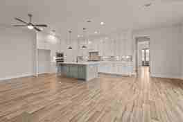 Step inside to an open-concept layout featuring a chef-inspired kitchen with quartz countertops, a stylish tile backsplash, custom cabinetry, and a large center island — ideal for entertaining. The adjoining living space is highlighted by wood-look tile flooring, abundant natural light, and a cozy stone fireplace.