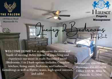 CALL FOR INFORMATION ON HOW TO APPLY. ASK ABOUT FURNISHED OPTIONS AND SHORT TERM! Luxury 2 bedroom, 2 bathroom apartment in Martinsville Va. Beautiful completely renovated furnished openings which include all utilities, water, cable, internet, trash. Let us do the hard part and you sit back and relax! Please submit the form on this page or contact Hauser Property Management Jimmy Cole at 434-483-8884 to learn more.