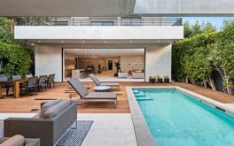 Fully furnished & modern WEHO gated home with rooftop deck near Melrose. 4 Bedrooms & 6 Baths!! Master bedroom, plus a junior master suite + 2 guest bedrooms all with their own en-suite baths, powder room & backyard bath. High ceilings, balconies, patios, floating staircases, sliding pocket glass doors and a rooftop deck. Open floor plan with white Italian porcelain tiles on the main floor with walnut hardwood floors on the second level. Pool, spa, cabana & fireplace. One bedroom downstairs with three bedrooms upstairs including a large junior master suite with it's own balcony. Large and spacious master bedroom with a great walk-in closet and an elegant master bath. 2 car garage + 2 car gated driveway. Laundry area.