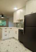 This apt has an open concept living room and kitchen perfect for entertaining. Quartz countertop with seating space for 4. Light hardwood oak flooring that was just refinished in both bedrooms, hallway and living room. High end tile in bath, kitchen and laundry room. Brand new white custom cabinets, New Slate Stainless GE appliances, new garbage disposal, Champagne Bronze fixtures as well. Black Hunter Ceiling fans with remotes in living room and both bedrooms. Desirable Boiler Heat and Swamp Cooler for those warm days.