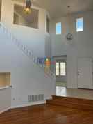The main level boasts a fully remodeled kitchen, adorned with white cabinets, stunning quartz countertops, a glass tile backsplash, undermount sink, and up-to-date stainless appliances. The house greets you with a spacious family room embellished with wooden floors, 2-story ceilings, and a ceiling fan.