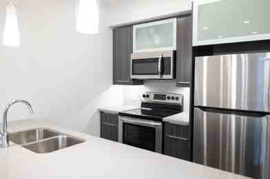 • Contemporary kitchen with quartz countertops, stainless steel appliances, and a functional island/breakfast bar