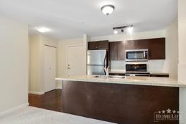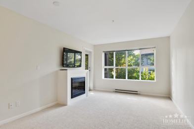 Large windows allow for lots of natural light in the unit. The kitchen has stainless steel appliances. double sink, and island seating. The living area features a cozy electric fireplace.