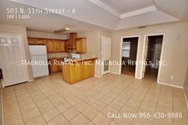 503 N. 11th Street in McAllen, TX offers a one-bedroom, one-bath apartment with an open floor plan and vaulted ceilings that enhance the living area. Hardwood floors and ceiling fans provide a clean, comfortable interior, while the master bath and in-unit laundry hookups add convenience. The unit includes a refrigerator and stove/oven, and central A/C keeps the space comfortable. Water and trash are included; the tenant pays all electric. The building offers upstairs units and 24/7 maintenance support. This no-smoking rental is available on a 12-month lease.