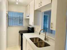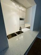 Downstairs one bed, one bath. The unit is in a quaint, small, owner managed, 20 unit building. This apartment is being totally remodeled with new quartz countertops in the kitchen, new wood flooring throughout the living room and bedroom, new ceramic tile in the kitchen and bathroom and a new washer and dryer installed in the unit. We are also adding French doors in the bedroom that will lead to a private patio. This property has gated, and reserved covered parking. The kitchen has quartz counters, full size refrigerator, electric stove, dishwasher and a built in stainless steel microwave over the stove. This unit has central air/heat and good natural light.